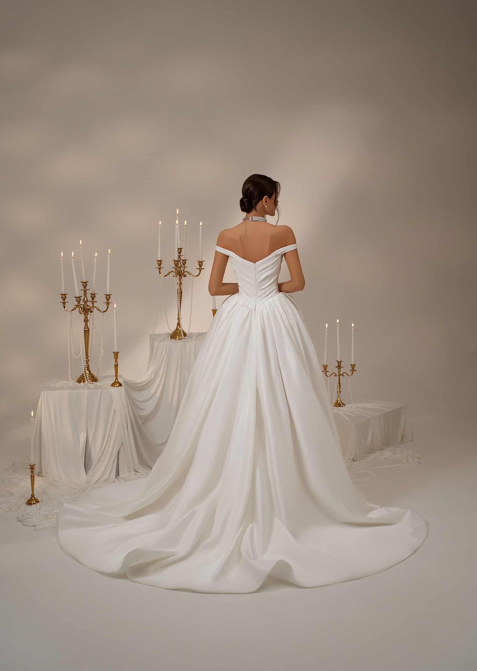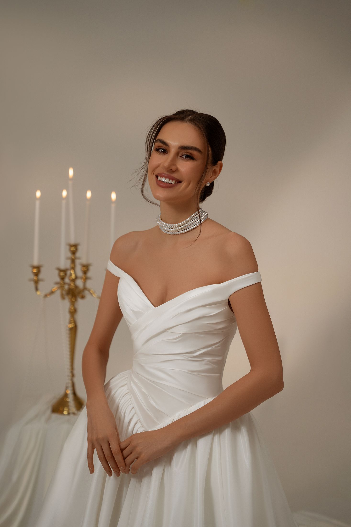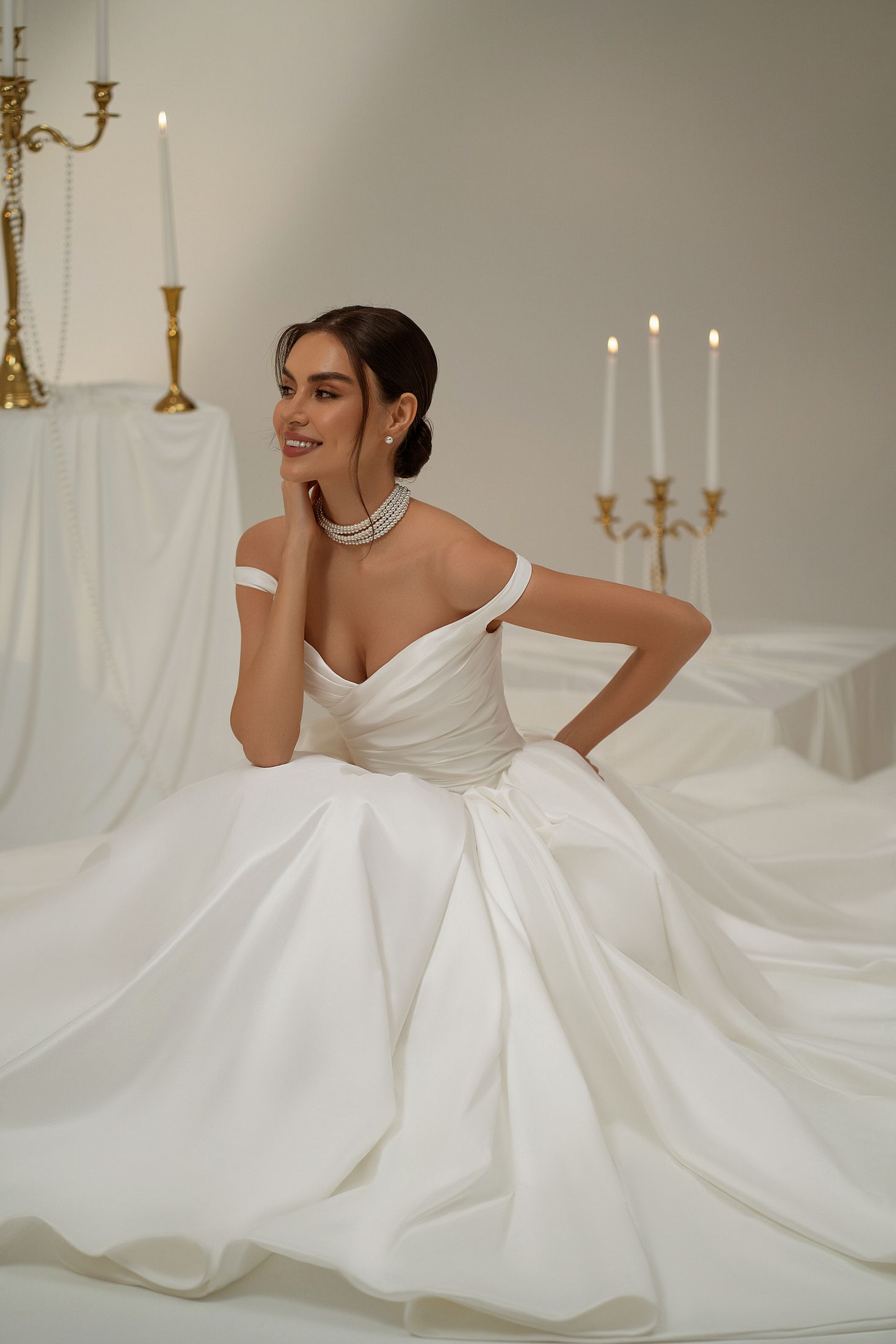 Open neckline with dropped straps, draped corset