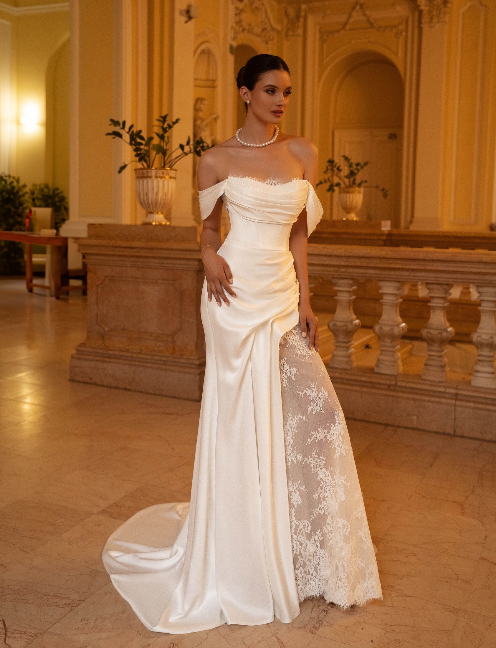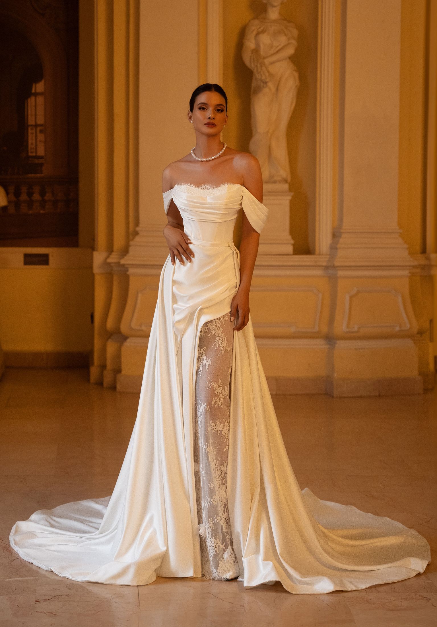 SKIRT: Fitted skirt, with lace insert, drapery and additional removable train