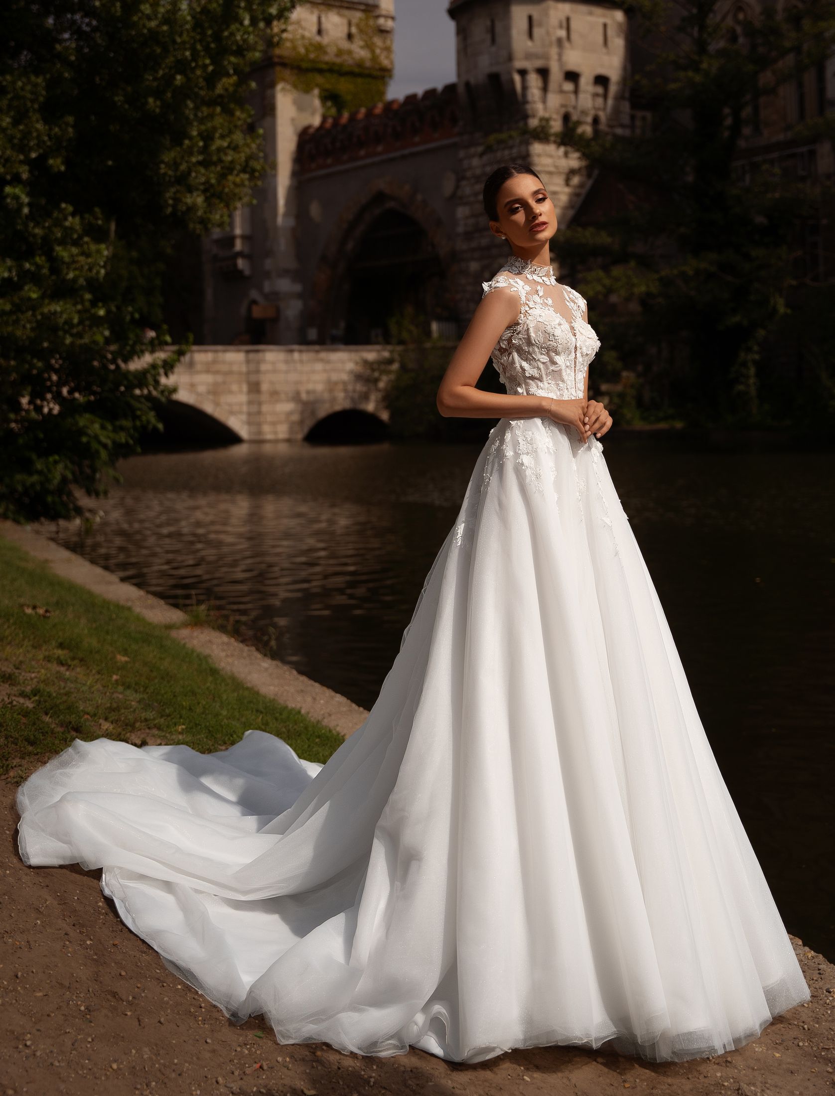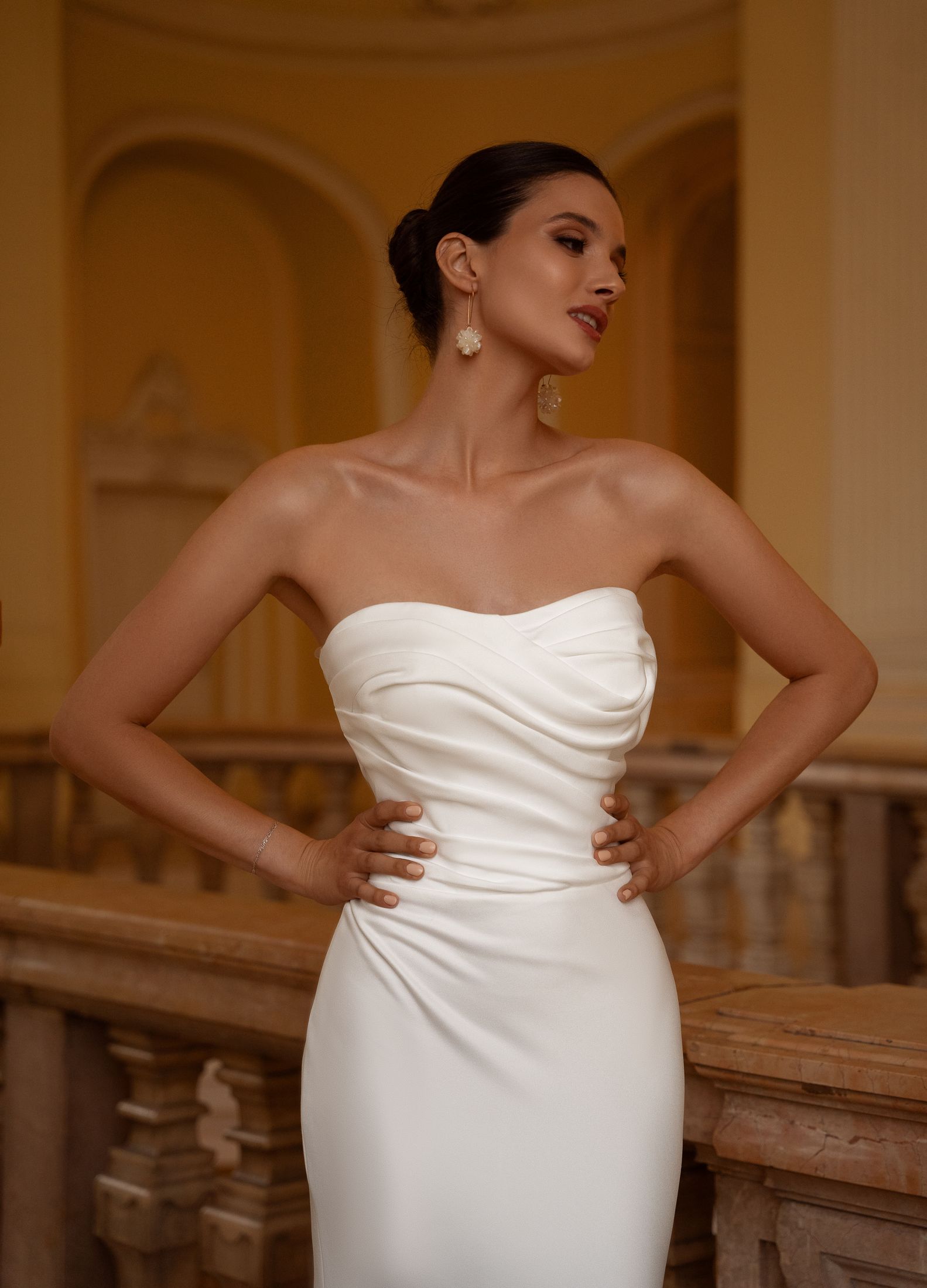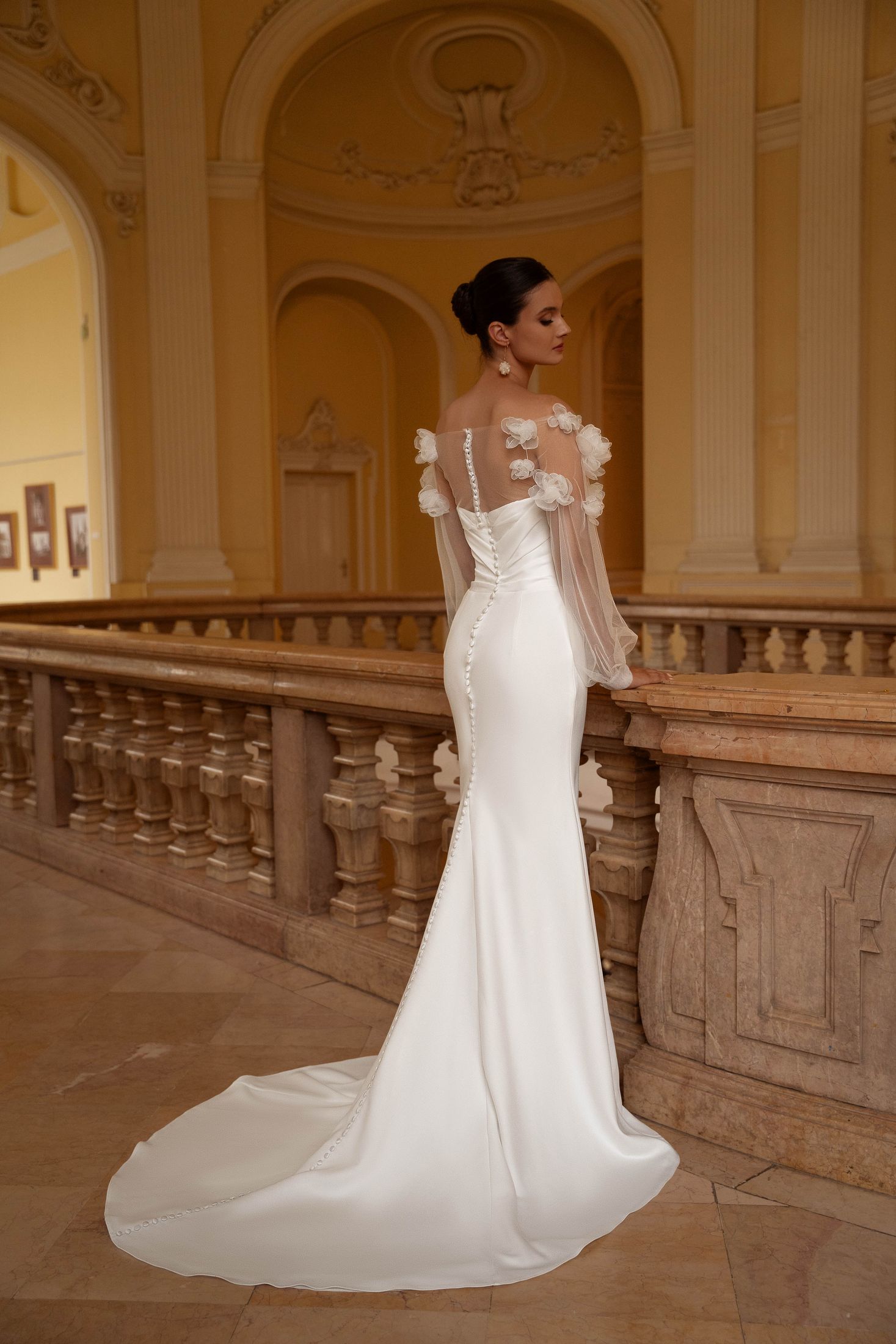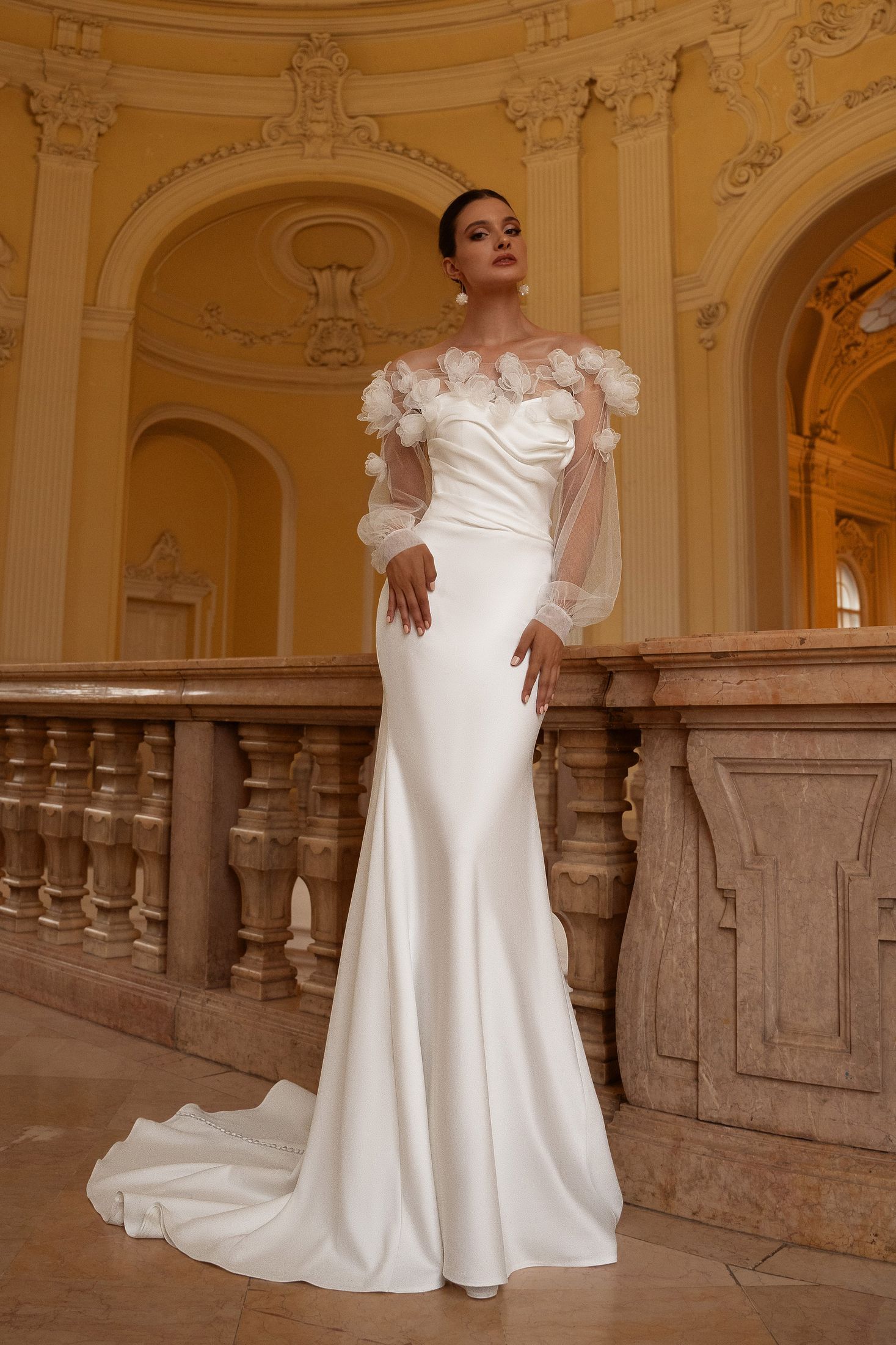Open neckline with drapery, additional removable cape